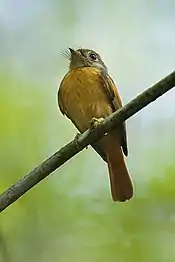 The existence of the family Tityridae (although simply treated as a clade) was first proposed in 1989 based on the morphology of several syringeal and skeletal features.[7] The existence of this family has later been confirmed by multiple studies involving both mitochondrial DNA and nuclear DNA.[8][9][10][11][12] Evidence suggests there are two basal clades within this family, the first including the genera Schiffornis, Laniocera, and Laniisoma (with strong bootstrap support), and the second include Iodopleura, Tityra, Xenopsaris, and Pachyramphus (with poor bootstrap support).[13]