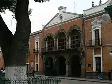 Significant communities outside the municipal seat include Ocotlán, San Estebán Tizatlán, San Gabriel Cuauhtla, San Hipólito Chimalpa, San Lucas Cuauhtelupan and Santa Maria Acuitlapilco.[3] The Sanctuary of Our Lady of Ocotlán was consecrated in 1854 and in 1905 it was declared the parish church of Ocotlán. In 1907, it was declared a collegiate church and in 1957, it became a minor basilica. The church is in Tlaxcalan Baroque style characterized by the use of tile and red brick. The façade is built to look like an altarpiece and topped with a seashell image. The main entrance is an arch flanked by estipite and Salomonic columns with have images of the doctors of the church, as well as the twelve Apostles. Saint Joseph appears in the arch. Above this is a figure representing the Immaculate Conception and Francis of Assisi. Near this is the choral window in the form of a stylized star. The towers were construction in the latter 18th century with arches and vegetative decoration. The cupola contains four mirrors with the cornice covered in gold leaf. The ante-sacristy has five oil paintings by Manuel Caro done in 1781 depicting scenes of some of the Virgin Mary's appearances. The sacristy has a painting of Saint Joseph by Joaquin Magón from 1754. The Guadalupe chapel to the side has lead figures of the Four Evangelists as well as paintings by Miguel Lucas Bedolla and Manuel Yañez. The image of the virgin is in a Baroque chamber decorated in plasterwork by Francisco Miguel Tlayoltehuanitzin between 1715 and 1740 and eight Salomonic columns.[2]