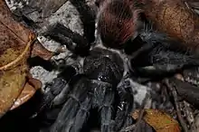 All species of Brachypelma, then including Tliltocatl, were placed on CITES Appendix II in 1994, thus restricting trade.[4] Nevertheless, large numbers of tarantulas caught in the wild continue to be smuggled out of Mexico.[5]