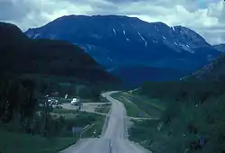 Toad River, originally Toad's River Post, is a highway service community in northern British Columbia, Canada, located at historic Mile 422 on Highway 97, the Alaska Highway, near the confluence of the Toad and Racing Rivers.[1] The community primarily serves travelers and tourists with a highway maintenance station; a lodge with a restaurant, campground and gas station; a public telephone and a private 3000 foot airstrip. The Toad River Lodge[2] boasts a "world famous" collection of over 10,000 hats (2016) thumbtacked to the ceiling, many of them donated by passersby on the Alaska Highway. Two miles north, The Poplars Campground offers camping, and motel rooms during the summer months (2011).