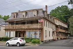 The Todd Block is a historic commercial and civic building at 27-31 Main Street in Hinsdale, New Hampshire. It consists of two separate buildings that were conjoined in 1895, creating an architecturally diverse structure. The front portion of the building is a 2+1⁄2-story wood-frame structure with Second Empire styling; it is only one of two commercial buildings built in that style in the town, and the only one still standing. It was built in 1862, and originally housed shops on the ground floor and residential apartments above. The front of the block has a full two-story porch, with turned posts, decorative brackets and frieze moulding. The corners of the building are pilastered, and the mansard roof is pierced by numerous pedimented dormers. The rear section of the building was built in 1895 as a hall for the local chapter of the Independent Order of Odd Fellows (IOOF). The principal feature of this three-story structure is its east facade, which has a richly decorated two-story Queen Anne porch.[2]