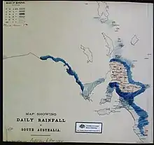 The charts were created by Sir Charles Todd's office at the Adelaide Observatory. In addition to the charts, the folios include clippings of newspaper articles and telegraphic and handwritten information about the weather. The area covered is mainly the east and south-east of Australia, with occasional reference to other parts of Australasia and the world.[1] The maps are bound into approximately six-month folios, 63 of which cover the entire period. There are approximately 10,000 continental weather maps along with 750 rainfall maps for South Australia, 10 million printed words of news text, and innumerable handwritten observations and correspondences about the weather.