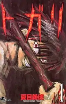Togari is written and illustrated by Yoshinori Natsume. The manga was serialized in Shogakukan's Weekly Shōnen Sunday from August 16, 2000 to February 27, 2002,[5][6] ending the series prematurely at 68 chapters. ending the series prematurely at 68 chapters. Shogakukan collected its chapters in eight tankōbon volumes, released from January 18, 2001 and March 18, 2002.[7][8] The abrupt ending was intentional by the publishers, as the last four pages of the 8th volume has a spoof advertisement for "Togari: The Perfect Edition". Then the publishers apologized for the spoof in the last page of the volume.[9] Media Factory republished the series in a four-volume edition,[10] released from October 23 to November 22, 2010.[11][12]