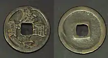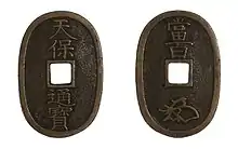 In 1835 the Tokugawa government started minting copper 100 mon named Tenpō Tsūhō (Kyūjitai: 天保通寶 ; Shinjitai: 天保通宝) as a way to solve its budgetary deficit, as the coin contained only 5½ as much copper as a 1 mon Kan'ei tsūhō this eventually lead to inflation.[6][7] This was later followed by the Satsuma Domain issuing a 100 mon coin of their own in 1862 to supposedly produce currency for the Ryukyu Kingdom, while in reality doing it to boost their own economy. These Ryūkyū Tsūhō (琉球通寳) coins eventually started circulating in other provinces as well.[8][9][10]