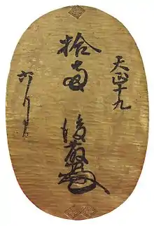 The Koban (小判) was a regular ovoid gold coin, equivalent to one Ryō. The initial Keichō Koban (minted from 1601) had a weight of 18.20g. The 1714 Sado Koban (佐渡小判金, 4th year of Shōtoku) also had a weight of 18.20g and was made with an alloy of typically 85.69% of gold and 14.25% of silver.[4]