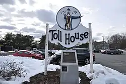 ![]() The restored sign of the Toll House Inn, with a commemorative plaque underneath | |
