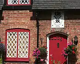 Each block has three unornamented doorways with arched heads.[1] Above the central doorway is a cast-iron plaque bearing the coat of arms of the Tollemache family and the date 1870.[1][14] The ground floor has four casement windows, one of two lights and three of three lights; there are four two-light casements to the attic floor, two of which are gabled dormers. All the windows are latticed in iron with a diamond pattern and have arched heads.[1]
