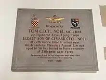 Noel was originally buried by the Germans at Westrozebeke, but was re-interred at the Perth (China Wall) Cemetery in Ypres, Belgium, in October 1924.[12] In Rutland he is commemorated in St Peter and St Paul's Church, Exton,[13] and on the war memorials at St Nicholas' Church, Cottesmore,[14] St Peter and St Paul's Church, Great Casterton,[15] and All Saints Church, Little Casterton;[16] in the village of Exton he also appears on the base of the war memorial cross to the dead of Exton and Whitwell and to relatives of the Earl of Gainsborough, including Maurice Dease VC.[17][18] He has a memorial plaque in the grounds of Eton.[19]