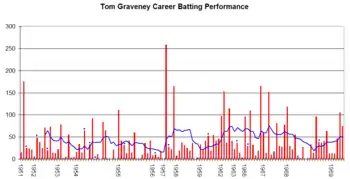 Hutton again curbed Graveney's attacking instincts during the 1953–54 tour of the West Indies after Graveney had started by hitting successive boundaries, telling him to "grind this one out".[4] Hutton later described Graveney as "not quite the chap for the big occasion" when Graveney's largest contribution to the 1954–55 tour of Australia was a century in the final Test match, by which point England had already won the series.[4] He had been dropped for two matches earlier in the series after being dismissed for 0 when playing an aggressive shot when the match situation called for caution.[2]