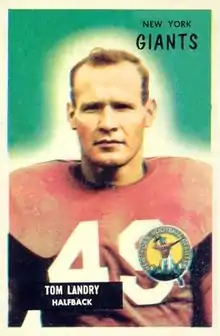 Landry developed the now-popular "4–3 defense" while serving as Giants defensive coordinator.[9] It was called "4–3" because it featured four down lineman (two ends and two defensive tackles on either side of the offensive center) and three linebackers – middle, left, and right. The innovation was the middle linebacker. Previously, a lineman was placed over the center. But Landry had this person stand up and move back two yards. The Giants' middle linebacker was the legendary Sam Huff.