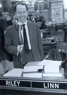 He was elected to the Iowa House in 1960, and served two terms, before being elected as one of the two Senators from the 20th district (Linn County); in 1968, he challenged incumbent Democrat John Chester Culver for Congressman from Iowa's 2nd congressional district, but lost by 84,634 votes to Culver's 103,651. He returned to the Senate, and would serve through 1974, when he again ran for the 2nd District Congress seat, and lost to Democrat Mike Blouin with 73,416 for Blouin, 69,088 for Riley, and 1,108 for James Whitford of the American Party. He was succeeded in the Senate by Democrat James Redmond. He again ran in 1976 against Blouin, losing by 100,344 votes to 102,980 for Blouin, 485 for an American Party candidate, and 741 for an independent.[6]