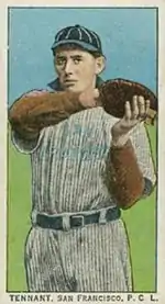 Tennant spent 1909 through 1911 with the San Francisco Seals of the class A Pacific Coast League.[1] In 1910, he had 231 hits in 223 games to lead his league in hits for the third time.[6] Then in April 1912, Tennant broke into the major leagues with the St. Louis Browns. He appeared in two games for them that month as a pinch hitter and went 0 for 2 at the plate with 1 run scored.[2] The Browns had used eight first basemen in 1911 but traded for veteran standout George Stovall from the Cleveland Indians in the off-season. A St. Louis newspaper commented that Tennant "had the goods, but he came just one year late to land the regular job".[3] The rest of the 1912 season, he played for the Western League's Sioux City Packers.[1]
