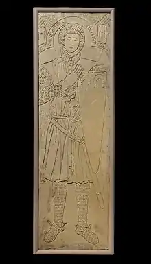The Tomb Effigy of Jacquelin de Ferrière is usually on display in the Medieval Art Gallery of the Metropolitan Museum of Art in New York. The effigy is of the French knight, Sir Jacquelin de Ferrière, who was from Montargis, near Sens in northern France. The effigy is dated between 1275-1300 CE. It is 73+3⁄4 in (187 cm) long, 24+5⁄8 in (63 cm) wide, and 5 inches (13 cm) deep, and carved into a flat limestone slab, which now has a wooden frame.[1] Effigies were often commissioned by the nobles or their families, as a means of remembrance. They would normally be found covering the sarcophagi of the knight, or installed in or near a church that the family were patrons of. Although the inscription on this effigy is not clear, most effigies contained similar inscriptions that would include the name and title, dates of birth and death–or approximates, a link between the date of death and a notable holy figure or day, and petitions of prayer that would offer pardons to those that prayed for the depicted soul–largely an attempt to create a tangible link between the nobility and divinity.[2]