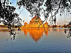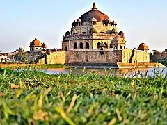His tomb is an example of Indo-Islamic architecture, it was designed by the architect Mir Muhammad Aliwal Khan and built between 1540 and 1545,[3] this red sandstone mausoleum (122 ft high), which stands in the middle of an artificial lake, which is nearly square, is known as the second Taj Mahal of India. The tomb stands at the centre of the lake on a square stone plinth with domed kiosks, chhatris at each of its corners, further there are stone banks and stepped moorings on all sides of the plinth, which is connected to the mainland through a wide stone bridge. The main tomb is built on octagonal plan, topped by a dome, 22-metre in span and surrounded ornamental domed kiosks which were once covered in coloured glazed tile work. The lake around the tomb is seen as a development in the Afghan phase of Sultan architecture by the Sur Dynasty.[4]