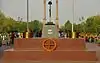 Burning in a shrine under the arch of India Gate since 1971 is the Amar Jawan Jyoti (the flame of the immortal soldier) which marks the Tomb of the Unknown Soldier. The shrine itself is a black marble cenotaph with a rifle placed on its barrel, crested by a soldier's helmet. Each face of the cenotaph has inscribed in gold the words "Amar Jawan" (Immortal Warrior) in Hindi (Devanagri script). The Prime Minister of India pays homage to the country's fallen soldiers along with the Chiefs of Staff of each arm of the Armed Forces on each Republic Day of India. | |
