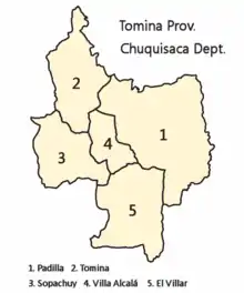 Tomina Province is divided into five municipalities which are partly further subdivided into cantons.
