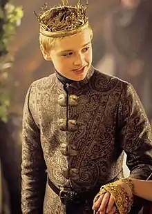 Tommen Baratheon is a fictional character in the A Song of Ice and Fire series of fantasy novels by American author George R. R. Martin, and its television adaptation Game of Thrones. Introduced in 1996's A Game of Thrones, Tommen Baratheon is the youngest son of Cersei Lannister from the kingdom of Westeros. He subsequently appeared in Martin's A Clash of Kings (1998), A Storm of Swords (2000), A Feast for Crows (2005) and A Dance with Dragons (2011). After the unexpected death of his brother Joffrey Baratheon, he is crowned king of the Seven Kingdoms, although he soon falls under the warring influences of his mother Cersei and wife Margaery.