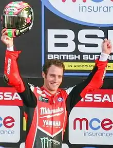 ![]() Bridewell wearing Milwaukee Yamaha colours acknowledging spectators' plaudits for his overall Championship third-place at Brands Hatch Showdown podium, end of BSB 2014 season | |