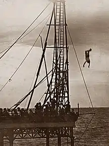 In July 1897, Burns dived 100 feet (30 m) into the sea off Rhyl Pier and was observed by around 3,000 spectators.[31] Some of the spectators thought he did not look well enough to be diving, with rumours that he may have been intoxicated with alcohol. Having kept the crowd waiting for around 45 minutes, when he did dive, he twisted awkwardly with a heavy landing on his back.[32] He was seen struggling to swim the 800 feet (240 m) back to the shore and when aided by swimmers and brought back onto the pier,[31] was found to be unconscious. Despite trying for 20 minutes to resuscitate, the coastguard were unable to save him and he was declared dead.[1] At the time of his death, he was described as "the undefeated champion of high diver of the world".[3]