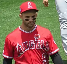 On November 29, 2018, the Cubs traded La Stella to the Los Angeles Angels for future considerations.[35] With 43 games played into the Angels' 2019 season, La Stella was their regular second baseman and leadoff man with a slash line of .301/.388/.611. He was among the league leaders with 11 home runs and 25 RBIs.[36] La Stella was chosen to appear in the 2019 All-Star Game, but on July 2 he fractured his tibia on a foul ball.[37] Before the injury, La Stella had been one of the Angel's most productive players. He had a .300 batting average with 16 homers and 44 RBIs in 78 games. La Stella did not return until late September, playing in two of the Angels' final three games.