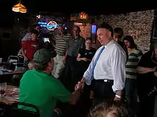 Thompson addressed the monthly meeting of the San Diego Republican Party on July 16,[18] before returning to Iowa on July 19 for the second leg of the "Common Sense Solutions Tour". He campaigned in the state for the next four days before taking a few days off. He returned to Iowa for the third and final leg of the tour on July 28 and remained there until the end of the month.[33] David Wise of Wispolitics.com following Thompson during part of the final leg of the tour. He maintained a blog that described every event attended by Thompson and his interaction with voters. Wise also witnessed a spat between Thompson and fellow presidential candidate Tom Tancredo. Thompson criticized Tancredo for negative campaigning after discovering that he had sent out a mailer that referred to Thompson as a "moderate governor" that supported amnesty for illegal immigrants. He labelled the mailer a "hate piece" put out by "somebody who's way behind and is trying to attack me".[40] At one event, as he countered Tancredo's claims, Tancredo himself entered the building, leading Thompson to point him out. He proceeded to list his accomplishments as governor and remarked "I have been against amnesty my whole career, contrary to what one of my opponents has said."[41]
