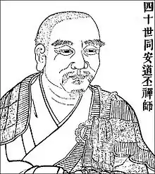 Tongan Daopi (Chinese: 同安道丕; Japanese: Doan Dōhi) was a Zen Buddhist monk during the end of the Tang Dynasty and the beginning of the Five Dynasties and Ten Kingdoms period. Very little is known about him. Traditional biographies record that he was the abbot of Tongan Monastery on Mount Fengchi near modern Nanchang.[1] The earliest source of information on monks of this era is the Zutang ji (Patriarch's Hall Record), which was completed in 952, but it fails to mention Tongan Daopi as a disciple of his supposed teacher Yunju Daoying. The Zutang ji does, however, record someone with the name Tongan asking a question to Yunju Daoying. The scholar Ui Hakuju has written this could likely refer to Tongan Daopi. He is first explicitly mentioned in the Transmission of the Lamp, which was compiled around 1004. However, in that work, it does not mention Tongan Daopi as having any disciples. The commonly accepted version of his lineage holds that Tongan Guanzhi is Tongan Daopi's successor. However, this comes from Huihong's Sengbao zhuan, which was completed in 1119, much longer after Tongan's death than the other works. The Transmission of the Lamp instead claims that Tongan Guanzhi is the disciple of a Tongan Wei, in turn a student of Jufeng Puman, with Jufeng being an apparently obscure student of the famous Dongshan Liangjie. Both Tongan Wei and Jufeng Puman are listed for the first time in the Transmission of the Lamp, and neither with much information. However, Dayang Jingxuan, who in Huihong's version of the lineage is a descendant of Tonagan Daopi, is recorded in the Transmission of the Lamp as being descended through Jufeng Puman and Tongan Wei. Dayang was close with Wang Shu, one of the compilers of Transmission of the Lamp, suggesting that it is unlikely that an error would have been made therein about his lineage. This suggests that Tongan Guanzhi is much more likely to have been a student of Tongan Wei and not Tongan Daopi as commonly accepted.[2]