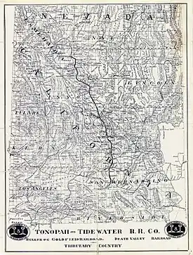 The railroad was originally intended to run from Tonopah, Nevada to San Diego, California (the "tidewater"), but never made it to either on its own rails. It was famous for being the last of the three railroads built to cross the Death Valley region, and outlasting them by over 30 years providing dedicated and reliable service to the desert residents. The T&T also formed part of a potential north-south transcontinental railroad route, connected together by four different US railway companies, later used as the basis to potentially form a Mid-Pacific Railroad.[2]