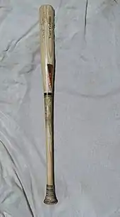 Among Gwynn's primary strengths was his patience in allowing the ball to reach the strike zone before starting his swing.[29] His bats were as small as anyone used during his career, and their lightness allowed him to wait longer before committing to his swing; he was rarely fooled by a pitch.[29] Growing up, he was not overparticular about his baseball bats, using anything that was available. Gwynn started with a 34-inch, 32-ounce aluminum bat in college. As a junior, he had to replace it after it got dented, and came across a 32-inch, 31-ounce model that was more to his liking.[174] At his first minor league stop at Walla Walla, the shortest bat they had was 34 inches. To Gwynn's surprise, he uncharacteristically started hitting home runs. On their first road trip to Eugene, Oregon, he acquired a couple of 32-inch bats that he could better handle.[34] In the first 12 years of his MLB career, Gwynn used a 32½-inch, 31-ounce bat. In his final eight years, he employed a 33-inch, 30½-ounce bat.[lower-alpha 4][11][29] Gwynn wanted his wooden bats light like his aluminum ones in college. Instead of having the barrel of his bats shaved, as many batters do, he had them "cupped", with the end of the barrel hollowed out like the bottom of a wine bottle.[175] His small hands required that he use thin-handled bats.[29] His bat control made him a good hit-and-run batter,[176] although some former teammates complained he would swing for a hit even when a player was trying to steal, depriving his teammate of a stolen base.[177][178]