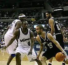 After initially playing backup to Antonio Daniels,[18] Parker became a starter and made 77 regular-season appearances in his rookie season, averaging 9.2 points, 4.3 assists and 2.6 rebounds in 29.4 minutes per game.[10] When he played against the Los Angeles Clippers on 30 November 2001, he became the third French player to play in an NBA game, after Tariq Abdul-Wahad and Jérôme Moïso.[21] By the end of the season, the rookie led San Antonio in assists and steals, and was named to the All-Rookie First Team for 2001–02, becoming the first foreign-born guard to earn the honor.[10]
