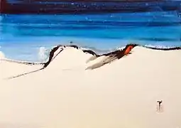 Smibert's art reflects three diverse streams of thought: Japanese minimalism, the early 19th century English School of Painting and Abstract Expressionism. He has been recognised as one of Australia's leading watercolourists.[4] His 1993 collaboration with Japanese couturier Yasuhiro Chiji led to a signature range of high fashion, yūzen kimono based on Smibert's watercolours.[5] Some works (for example his Yosemite Valley watercolours and acrylics) are clearly inspired by the study of Turner, Caspar David Friedrich and the early 19th century philosophy known as the Sublime. For Australian landscapes Smibert sometimes uses local iron ore as pigment.[6] Smibert's art is deeply informed by his study in aikido. His larger acrylic abstracts use the energy flow ('ki') of aikido to create a broad calligraphy reminiscent of Franz Kline and Action Painting. Smibert's career includes exhibitions in Europe, South East Asia, Japan, the Americas and Australia.[6][7]