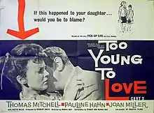 Too Young to Love is a 1959 British drama film set in New York. It was directed by Muriel Box and starring Pauline Hahn, Joan Miller, and Austin Willis.[1] It was based on the play Pickup Girl by Elsa Shelley.[2] An adaptation of the story was broadcast on British TV on 6 December 1957 in the ITV Television Playhouse series.