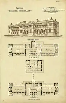 The idea of erecting a hospital in Toowoomba was discussed with the very early services to be provided in the town - reflecting the importance of a local health service for the early town. Discussions began in 1856 in the nearby town of Drayton which was soon overshadowed in development by the more dramatic growth of Toowoomba and therefore, by June 1859 a small house was rented in Russell Street for the purpose of providing hospital services. By 1864 a timber hospital was constructed at the corner of James and Ruthven Street on land granted by the Colonial Government. This building was destroyed by fire on 25 December 1867, and plans for a brick building on the same site were drawn up by Richard George Suter, a Brisbane architect influential in hospital design in the late 1860s. Suter was an advocate for hospitals based on the pavilion plan principle, which maximized light and ventilation to all patients, and this early Toowoomba hospital was one of the first examples of this principle, which was to remain current for the design of hospital buildings through to the 1930s.[1]