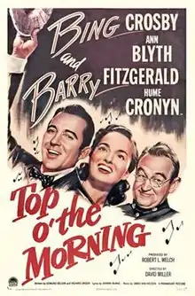 Top o' the Morning is a 1949 American romantic comedy film directed by David Miller and starring Bing Crosby, Ann Blyth, and Barry Fitzgerald.[2] Written by Edmund Beloin and Richard L. Breen, the film is about a singing insurance investigator who comes to Ireland to recover the stolen Blarney Stone—and romance the local policeman's daughter.