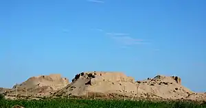 The ruins of the city were explored by the Chorasmian Expedition under the guidance of Sergey Tolstov in 1938.[1] The date of the palace has been determined by the discovery of coins of the Kushan Empire rulers Vima Kadphises and Kanishka, as well as coins of the Khwarazmian king Artav (Artabanus).[5] Wall paintings representing Zoroastrian deities were discovered in the Palace.[1]