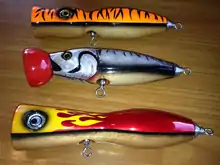 A topwater fishing lure or walker is a type of surface fishing lure, usually floating just at the water surface, that may be moved about the surface of water in order to attract and cause fish to attempt to strike the lure. Non-floating versions may be retrieved at sufficient speed to cause them to travel at the water's surface.