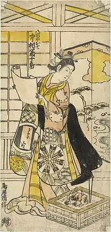 Torii Kiyonobu II (Japanese: 二代目 鳥居 清信 Nidaime Torii Kiyonobu; active 1725–1760) was a Japanese ukiyo-e artist. He headed the Torii artistic school from possibly as early as 1725, when its founder Torii Kiyonobu I retired. Kiyonobu II was a prolific designer of actor prints, principally in the narrow hosoban format, of which he produced at least 300 examples for about 20 different publishers. He and Torii Kiyomasu II were the main Torii artists of their time[1] and have been rumoured to be the same person.[2] Kiyonobu II's last known work is an actor print dated to 1760.[1]
