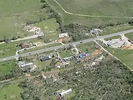 Storm chasers in the region reported multiple funnel clouds and two touchdowns, neither of which resulted in damage. Several tornadoes were confirmed through storm chaser video and local emergency management services. A large, intense tornado later caused severe damage in and around the towns of Atoka and Tushka. Many houses were destroyed or flattened from what was at times a double tornado with two well-defined vortices. Numerous injuries were reported in the latter of these areas.[10] Two died and 43 more were injured in Tushka.[11] In Arkansas, strong winds produced by thunderstorms killed at least seven people.[12][13] Of those deaths, five were confirmed to have been from straight-line winds and two were as a result of a weak tornado embedded in an overnight squall line that tracked across the state.[14]