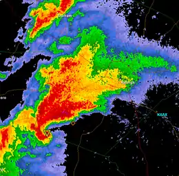 Moving into the suburban southwest of Wake County, the tornado maintained EF0/EF1 intensity as it moved through the community of Holly Springs. However, many trees and power lines were downed, numerous houses were damaged, and several people were injured. In addition, debris tossed by the tornado was picked up by radar and pieces of destroyed homes were reported to have fallen in the adjacent towns of Apex and Cary. The tornado continued to track northeast, in the direction of downtown Raleigh; by this time a very sharply defined hook echo was visible on local radar. The tornado began passing through suburban subdivisions on the southwest side of Raleigh as it approached Downtown. Many homes sustained damage, mostly to roofs and from falling trees.[29] The tornado still maintained EF1 intensity as it passed through neighborhoods into downtown Raleigh. Severe damage was reported to many commercial businesses in the South Saunders Street (U.S. 70) area south of downtown near Interstate 40. Many local thoroughfares and neighborhoods were rendered impassable due to building debris, tree damage, and downed power lines. The Shaw University campus was badly damaged by the tornado. Live WRAL camera footage showed [30] a rain-wrapped tornado approach the city from the southwest and cross I-40 at South Saunders Street, accompanied by power flashes and flying debris. Many homes and businesses in the Raleigh area were badly damaged. Damage in the downtown area was rated EF1.[27]