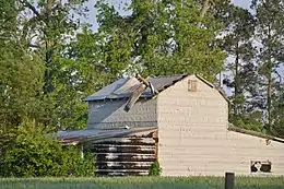 As the tornado crossed MS 39, it continued causing extensive tree damage, with large swaths of land where nearly every tree was snapped, many of which were debarked. In addition, a site-built home suffered heavy roof and structural damage, another home sustained heavy roof damage, and several outbuildings were destroyed. Here, the tornado reached its maximum width at 3⁄4 mile (1.2 km), before weakening and narrowing a little and crossing Mississippi Highway 16 again, just west of Scooba. Numerous trees and a couple of power poles were snapped in this area. The tornado then crossed US 45 to the south of Scooba with a relatively narrow but intense damage swath that was rated high-end EF2 to low-end EF3. A large warehouse building was completely destroyed, three homes sustained roof damage, and a pickup truck was thrown a considerable distance. More intense tree damage occurred in this area with debarking and denuding. The tornado widened again east of Scooba, causing heavy damage along Mississippi Highway 16 near Giles Road. Several homes sustained heavy roof damage, power poles were snapped, and more trees were denuded. About 3200 acres of pine and hardwood forest were damaged in Kemper County.[25]