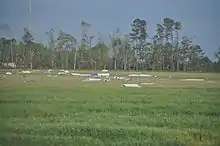 Bertie County emergency officials reported widespread catastrophic damage in the Askewville area, as 67 homes and 37 mobile homes were destroyed, with some homes ripped off their foundations. One business was also destroyed, and 19 other structures sustained lesser damage. There had also been some damage done to emergency vehicles as officials tried to clear the roadways in the damage path. The tornado destroyed seven mobile homes at Jake's Trailer Park, located off of Askewville Road, injuring two people.[42] This long-track tornado was the deadliest of the entire outbreak, killing 11 people (including a family of three and another couple) when the tornado hit areas a couple miles west of Colerain, and injuring 58 other people along its entire path.[43][44] On April 20, one of the injured people died at Pitt Memorial Hospital, increasing the death toll from the tornado to 12.[45] The tornado moved into Hertford County, damaging and destroying many more homes before dissipating at 7:10 p.m. EDT (23:10 UTC).[46] Another tornado touched down northwest of Colerain and tracked parallel to this tornado; it was rated EF2.[47]