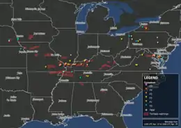 | 1Most severe tornado damage; see Fujita scale 2Time from first tornado to last tornado | |
