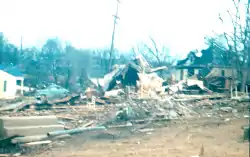 The tornado traveled 3.3 miles (5.3 km), was 400 yards (370 m) wide [nb 4], destroyed 12 homes, and damaged 20 other homes. It also destroyed 25 other buildings and damaged 35 others. Although no damage value was given, it is estimated that tornado did anywhere between $150,000 to $400,000 in damage. There were 12 injuries.[2][5][3][10]