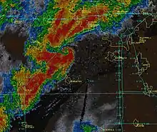 Storm coverage over eastern Kansas soon increased as well, with the main threat being damaging winds.[40] Further north over parts of Iowa and Minnesota, a mid-level vortex over the region accompanied by scattered thunderstorms presented a risk of severe storms. Increasing wind shear and an influx of moist air from the south was expected to allow convection to persist over the region for much of the evening, with the main threat being damaging winds and a few tornadoes.[41] By the evening hours, several squall lines developed across the region. Unstable air over much of Missouri allowed for these storms to maintain themselves as they moved slowly eastward.[42] Around 7:00 p.m. CDT (0000 UTC), a rapidly moving vorticity maximum over Iowa resulted in a significant increase in thunderstorms over the area, some of which were tornadic.[43] The most intense cell tracked from Dallas County to Story County, producing three brief tornadoes and straight-line winds along its path.[44] The touchdowns in Iowa marked the end of a record 358-day span with no tornadoes in the state.[45][46]