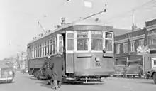 The A- and A1-class cars were operated from the mid-1920s as six-motor trains with an A1-class (four-motor) car leading a coupled A-class (2-motor) car.[4] These trains required a crew of three, two for the lead car and another for the trailing car.[5] Six-motor trains lasted until 1933 when the A-class cars were retired due to a decline of ridership during the Great Depression. After the retirement of the A-class cars, the A1-class cars would pull a Class N or Q trailer until 1934.[6]