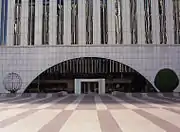 The structure has a rectangular footprint with a windowless two-storey base. A wide round arch, resting on an underground steel structure for support, serves as the entrance and supports the façade above. The opening under this arch is covered by a special security glass named STADIP (the one used in Torre Agbar in Barcelona). Windows on floors 3 through 43 are grouped in twos divided by a slender pier. The groupings are divided by larger piers into 15 bays across the front of the building and 11 bays on the sides. The façade is covered in white aluminum and the corners of the structure are chamfered.[1] The top two floors are also windowless and the parapet flares to form a cornice. Elevators, in three groupings, occupy a bay in the rear of the structure along with stairways.
