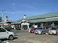 A view of the station entrance looking north. The structure with the pointed tower is the Rainbow Bridge.