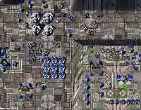 The player can command a variety of units including infantry bots, vehicles, ships, hovercraft, aircraft, powerful stationary long range weapons, and even a giant mecha known as the Core Krogoth. Units vary in size, speed and the ability to give and take damage, depending on their tech level. The strongest units take longer to build as well as cost more resources. Each unit has strengths and weaknesses, optimal styles of use, and corresponding units against which it is vulnerable or well-suited. Effective play is usually characterized by consideration of these attributes, as well as efficient resource management, strong defenses, and knowledge of the opponent's strategies. The game's interface consists of construction and command buttons (depending on the unit selected), unit status information, resource information on the production of Energy and Metal, and a minimap which gives an overview of the game's battlespace – the visibility of which may be hindered by fog of war, necessitating the use of radar or scout units. There are a few highly advanced units which are invaluable combat-wise, such as nuclear missile launchers which have enormous range and very high damage, as well as long-range artillery that have enough range to attack any point on smaller maps. There are two story-related factions, Arm and Core, which have comparable sets of units (one side a little bit faster, other one a little bit tougher etc.), but are aesthetically different.[13] Generally, the Arm have faster, sleeker units while the Core units are built to take slightly more punishment. This is shown exceptionally well by the Arm being able to build an extremely fast Kbot known as the Zipper, while the Core can build an armored Kbot known simply as The Can. When playing amongst experienced players, subtle differences between the two factions put Core players at a disadvantage. The most noticeable differences are as follows: The level 1 Arm fighter aircraft is 1.7× more maneuverable than its Core counterpart, the Arm commander walks 1.12× faster than the Core commander, amphibious Arm Kbots float above water, making them faster and more useful than their submerging Core counterparts, Arm players can build Farks, fast assistant repair Kbots which can be crowded around labs and structures to dramatically reduce build times, and level 1 Arm tanks are equipped with superior weapons. Core has some distinct advantage as well, such as superior naval units, level 1 bombers that drop more bombs, and less conspicuous nuclear facilities. These advantages, however, are overshadowed by the Arm advantages in most situations.