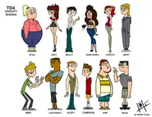 In the early production stages, the character lineup had twelve contestants, and most of them had body shapes, colors, clothing, heights, hair styles and faces that were completely different from the final designs. The thirteenth character who was added later was B. His design was similar to that of the character used in the Total Drama Island special as the man in the car when Courtney "discovered" civilization. That character also happened to be DJ's prototype from the original Camp TV promos.[25] Jo was later renamed to B (which stands for Beverly) while also getting his final design. The only other characters to have their name changed was Mary; she ended up using the name 'Jo'. Despite the rename, this character underwent the least amount of change in design. The other contestant who got renamed was Molly, being renamed to 'Zoey', while also carrying over her label. Anne Maria, Brick, Lightning and Scott had minor modifications made to their outfits. Sam and Scott had different facial hair. The characters who had the most changes made to their designs were Dakota, Staci, and Zoey. Zoey's final design actually used the clothing and body shape from the original design for Dakota. Mike and Cameron had their ethnicities changed. Dawn, who was not in the original lineup, replaced an unused character named Zoey. Cameron's initial design would be reused for Jay and Mickey on Total Drama Presents: The Ridonculous Race.[3]