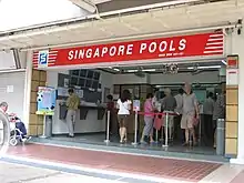 Toto (est. in 1968 and stylised as TOTO) is a legalised form of lottery sold in Singapore, known by different names elsewhere. It is held by Singapore Pools, the only legal lottery operator in Singapore.[1] As of April 2015, it was the second most popular type of gambling activity after 4-Digits.[2] Toto can be purchased from any of the Singapore Pools outlets across Singapore. Draws are conducted every Monday and Thursday at 6:30 pm (SG time). In case of the cascade draw, the draw time will change to 9.30 pm.[3] The "live" Toto draw can be viewed at the Singapore Pools Main Branch at 210 Middle Road. The profits from Toto go to the Singapore Totaliser Board (the owner of Singapore Pools) which uses the money for charity and other worthy causes.