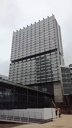 Designed by Jean-Claude Burdèse and Claude Vasconi,[1] 110 m high, it is the second tallest tower in Lille after the Tour de Lille. The Tour Euralille and its atrium span the Lille-Europe station, which represented a real technical challenge during its construction. The mixed structure of the tower, produced by the company Rabot Dutilleul Construction, consists of a reinforced concrete ladder beam which is supported by a metal frame supporting the suspended floors.[2]